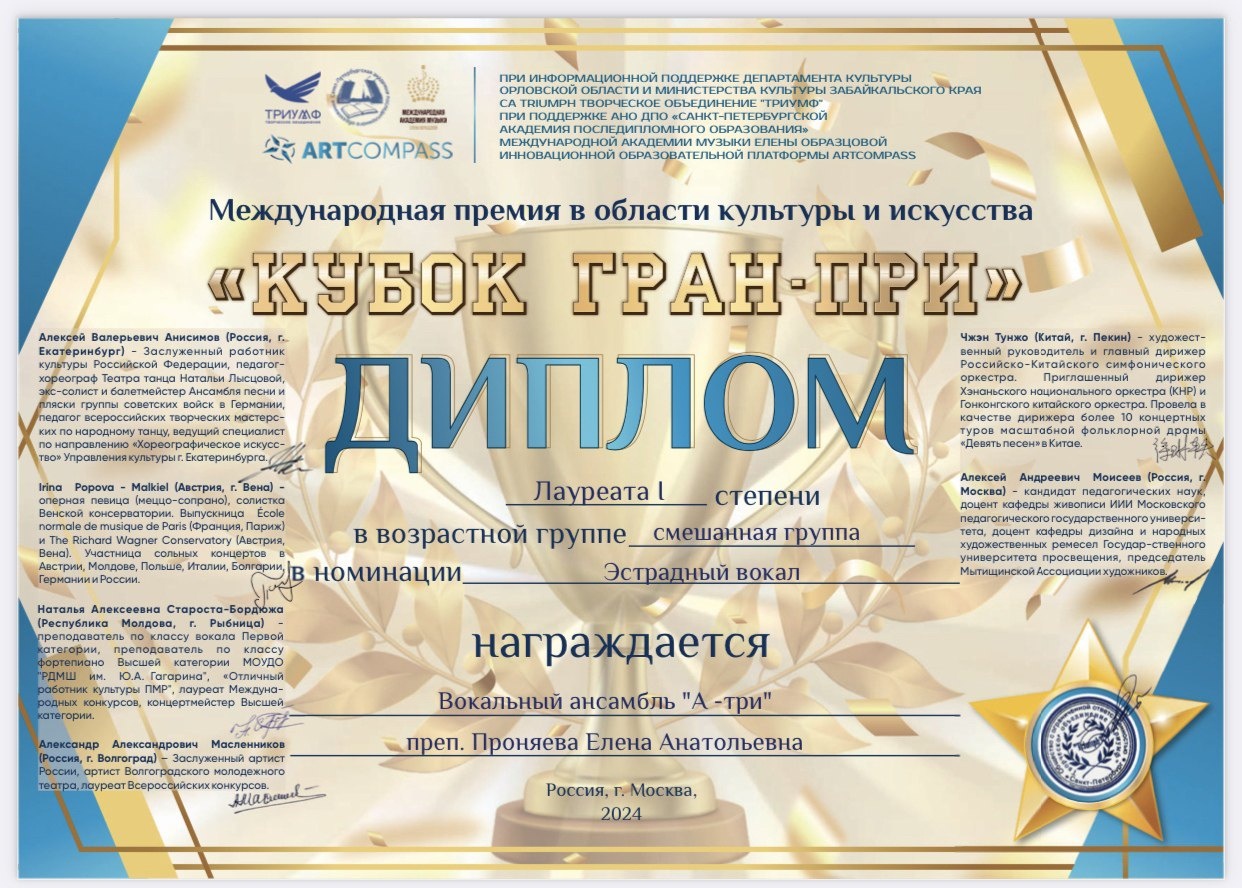 29 января 2024, Понедельник 02:01 Просмотров: 708Поздравляем вокальный ансамбль "А-три" (преподаватель Елена Анатольевна Проняева) с замечательным результатом (Лауреат I степени) в конкурсе Международная премия в области культуры и искусства "Кубок Гран-при"! Молодцы! Желаем не останавливаться на достигнутом и идти вперёд к новым ярким победам!