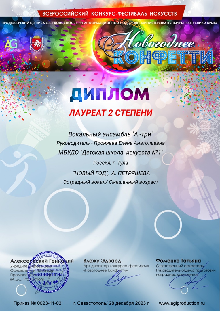 22 января 2024, Понедельник 12:01 Просмотров: 685Поздравляем вокальный ансамбль "А -три" (София Зорина, Маргарита Губанова, Валерия Петрунина, Маргарита Баранова, Иван Лапин, Екатерина Лапина), преподаватель Елена Анатольевна Проняева с Дипломом 2 степени Всероссийского конкурса -фестиваля "Новогоднее конфетти". Молодцы! Желаем дальнейших творческих успехов, достойных выступлений и ярких побед на конкурсах!