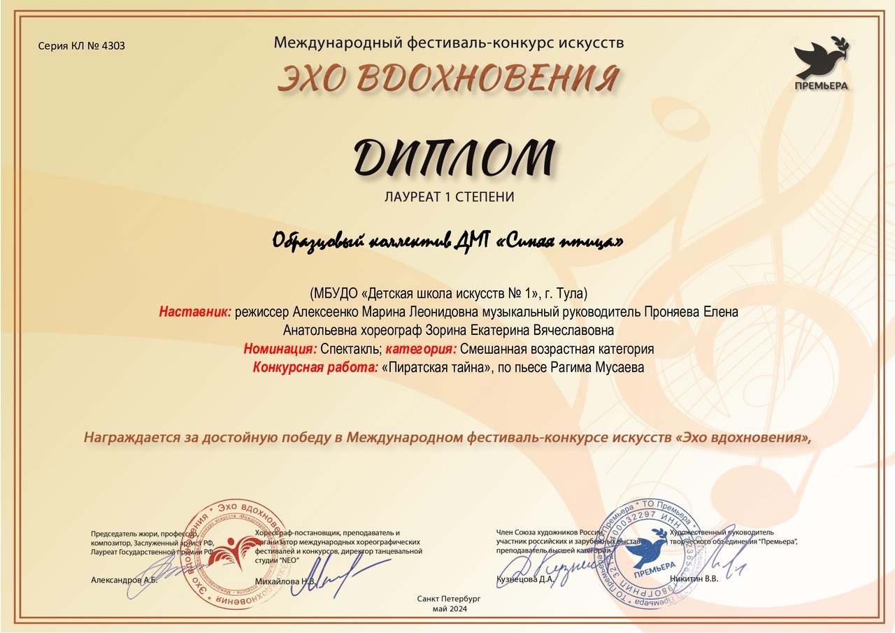 20 мая 2024, Понедельник 01:05 Просмотров: 707Поздравляем юных артистов образцовых коллективов ДМТ "Синяя птица" и хореографического ансамбля "Вдохновение" с Дипломом лауреата I степени Международного фестиваля-конкурса "Эхо вдохновения"!