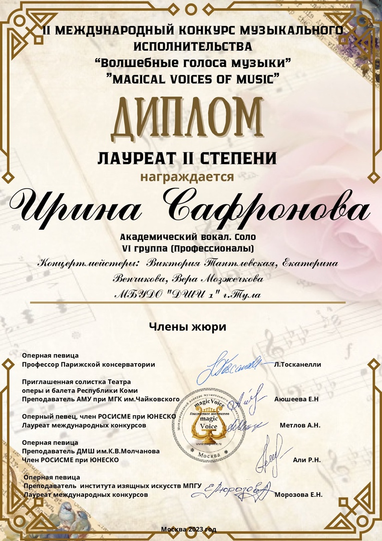 Поздравляем преподавателя нашей школы Ирину Олеговну Сафронову (концертмейстеры Виктория Пантлевская, Екатерина Венчикова, Вера Мозжечкова) с ПОБЕДОЙ (Диплом лауреата II степени)