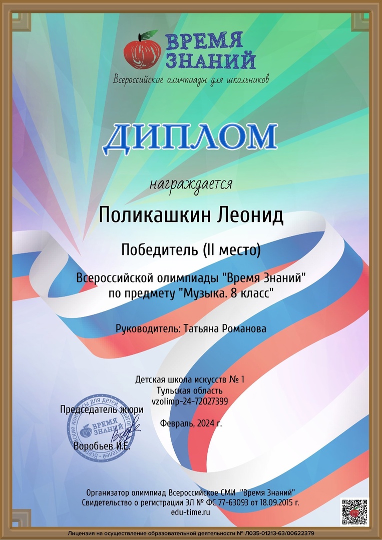 26 марта 2024, Вторник 07:03 Просмотров: 641Поздравляем ПОБЕДИТЕЛЯ (II место) Всероссийской олимпиады «Время знаний» Леонида Поликашкина (преподаватель Татьяна Викторовна Романова).